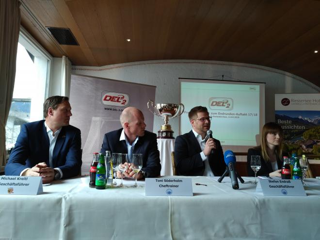 Im Rahmen der Endrunden-Auftakt-Pressekonferenz waren Vertreter der DEL2-Clubs aus Garmisch-Partenkirchen, Kaufbeuren und Bad Tölz zugegen.
