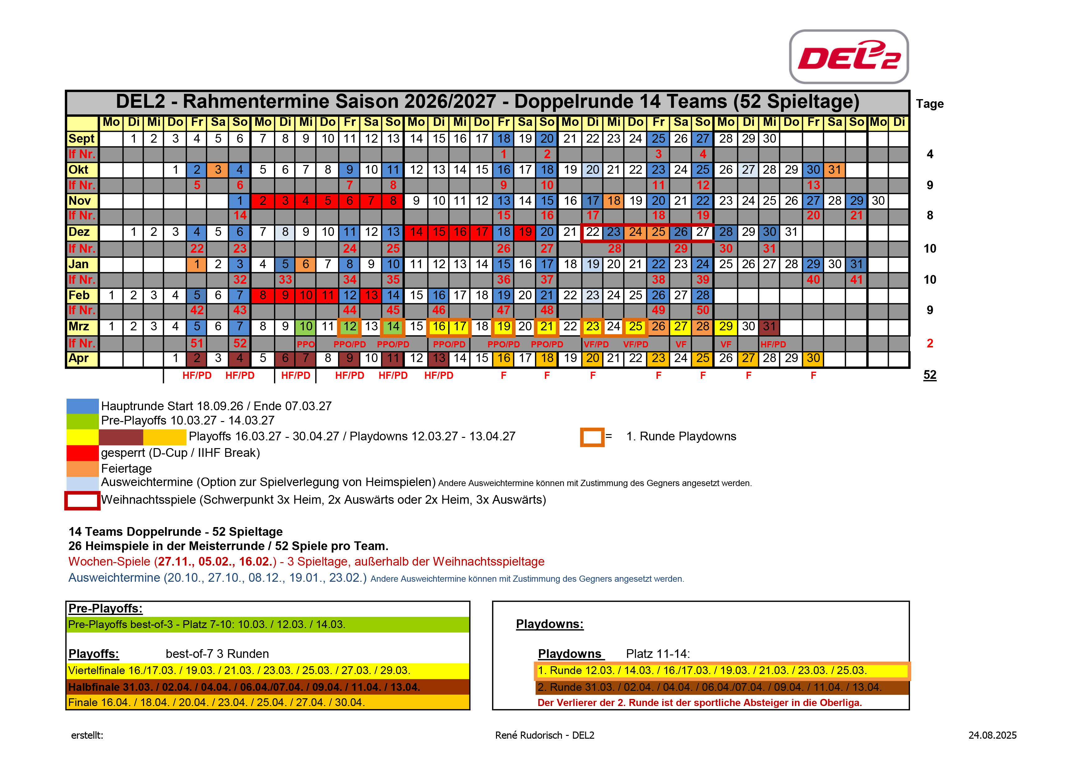 René Rudorisch, Geschäftsführer der DEL2: „Schon heute wollen wir den Blick auf die neue Spielzeit richten. Mit dem Rahmenterminplan schaffen wir regelmäßig die notwendige Planungssicherheit für die Arenen und ermöglichen es den Clubs, frühzeitig in die operative Vorbereitung zu gehen. Besonders die weitere Reduzierung der Wochenspieltage ist ein positives Signal an unsere Spieler und Fans, da wir die Belastung besser steuern und die Attraktivität der Wochenendspieltage stärken.“