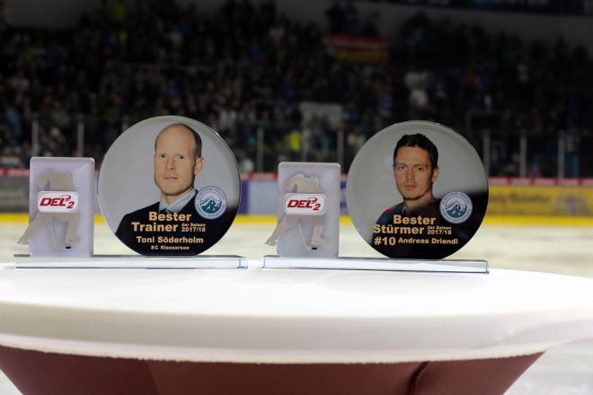 SC Riessersee kann nun alle gewonnenen Auszeichnungen sein Eigentum nennen: Im Rahmen der Viertelfinal-Begegnung zwischen Garmisch-Partenkirchen und Crimmitschau wurden nach dem Spiel der Trainer und Stürmer des Jahres ausgezeichnet. Sebastian Groß von der Eishockey NEWS überreichte die edlen Glasauszeichnungen an Toni Söderholm und Andreas Driendl nach der Partie. Hergestellt wurden die Trophäen in Zusammenarbeit mit Mauritz Individual.