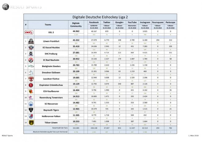 Positive Entwicklung in der digitalen Welt: Kürzlich hat der DEL2-Partner RESULT Sports, um Geschäftsführer Mario Leo, eine aktuelle Erhebung der Social Media-Kennzahlen für die zweite Profiliga vorgenommen. Aktuell liegt die Gesamtkontaktzahl von Liga und Clubs in den sozialen Netzwerken bei über 330.000. Vor Saisonbeginn lag die Reichweite noch unter 300.000. Das bedeutet eine Steigerung bis März von über elf Prozent.